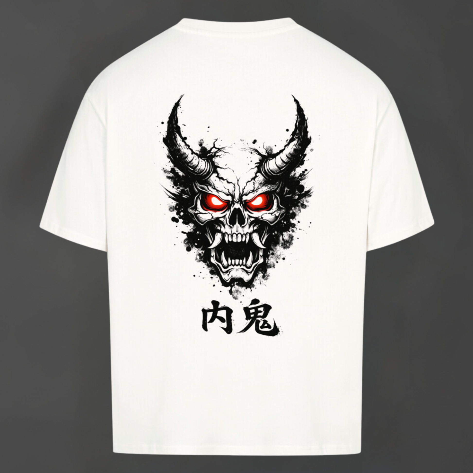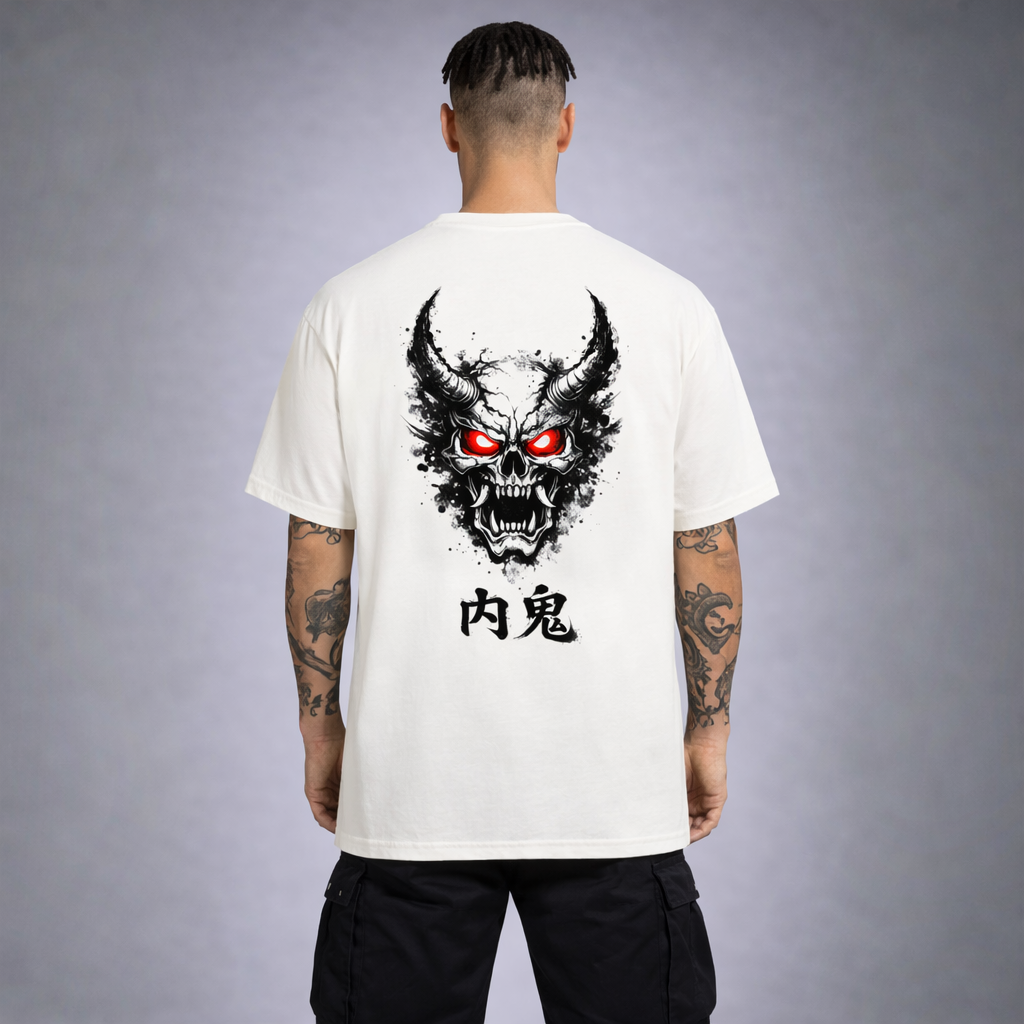 The Mask Breaker T-shirt depicts the moment an oni mask shatters, revealing a human underneath. Shards fly like fragments of a hidden identity.