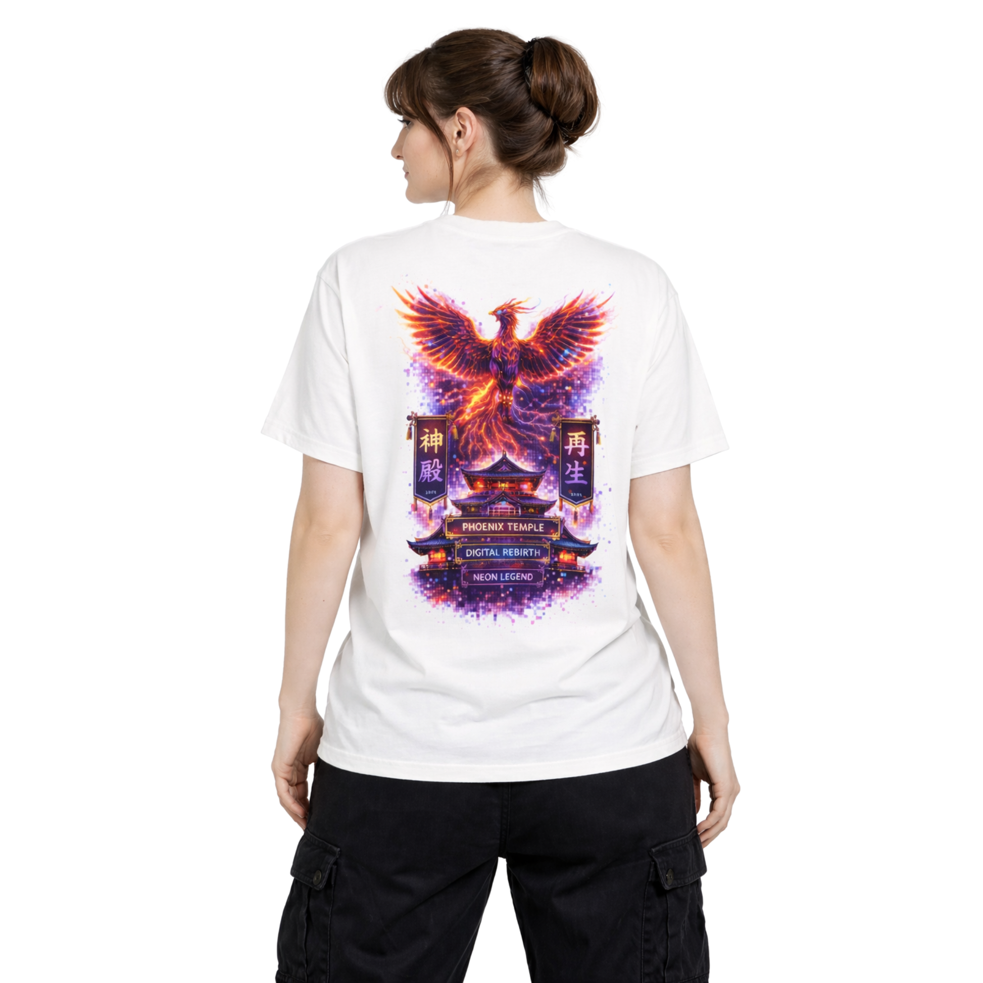 The design depicts a traditional temple, above which a powerful phoenix rises, created from neon energy. Architecture and mythology merge to form a symbol of rebirth and spiritual strength.