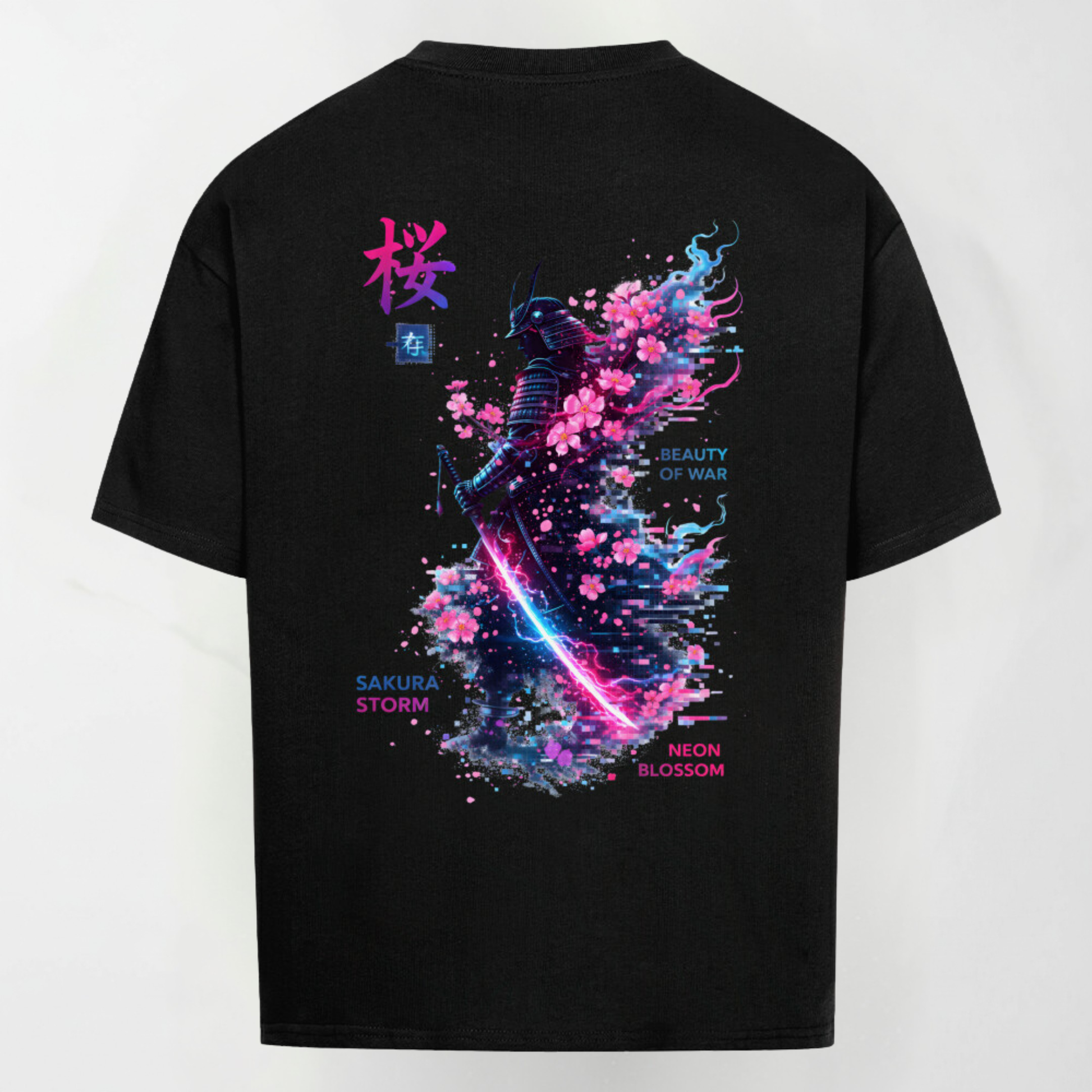 The image depicts a samurai surrounded by a storm of cherry blossoms and neon energy. Beauty and war merge in a single moment.