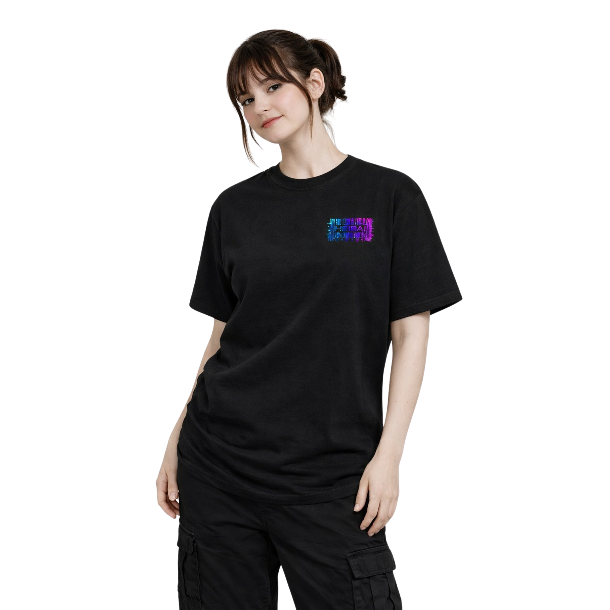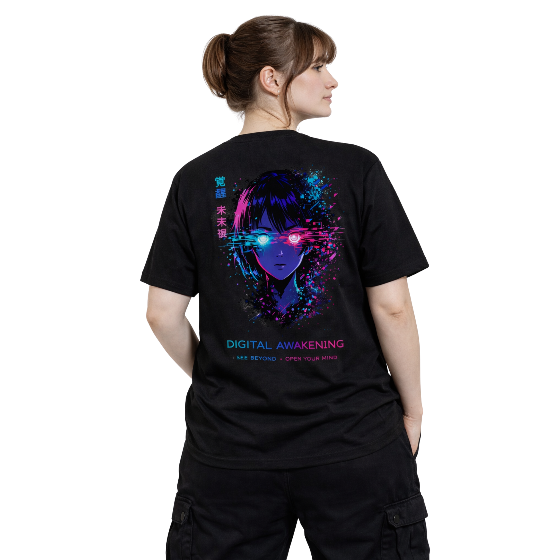 The Digital Awakening T-shirt combines comfortable material with a modern cyberpunk design. The high-quality print ensures that the intense colors and glitch-like effects last a long time.