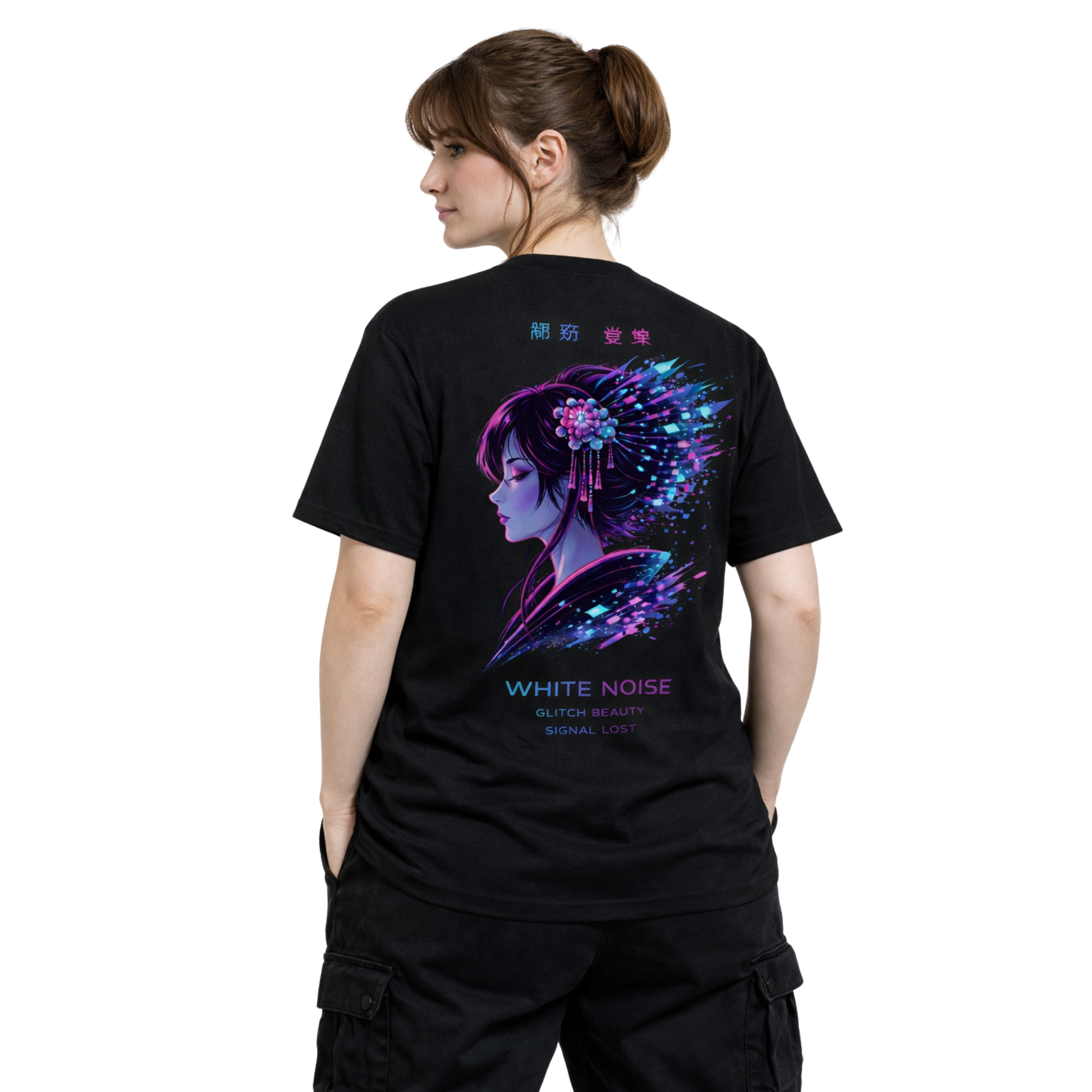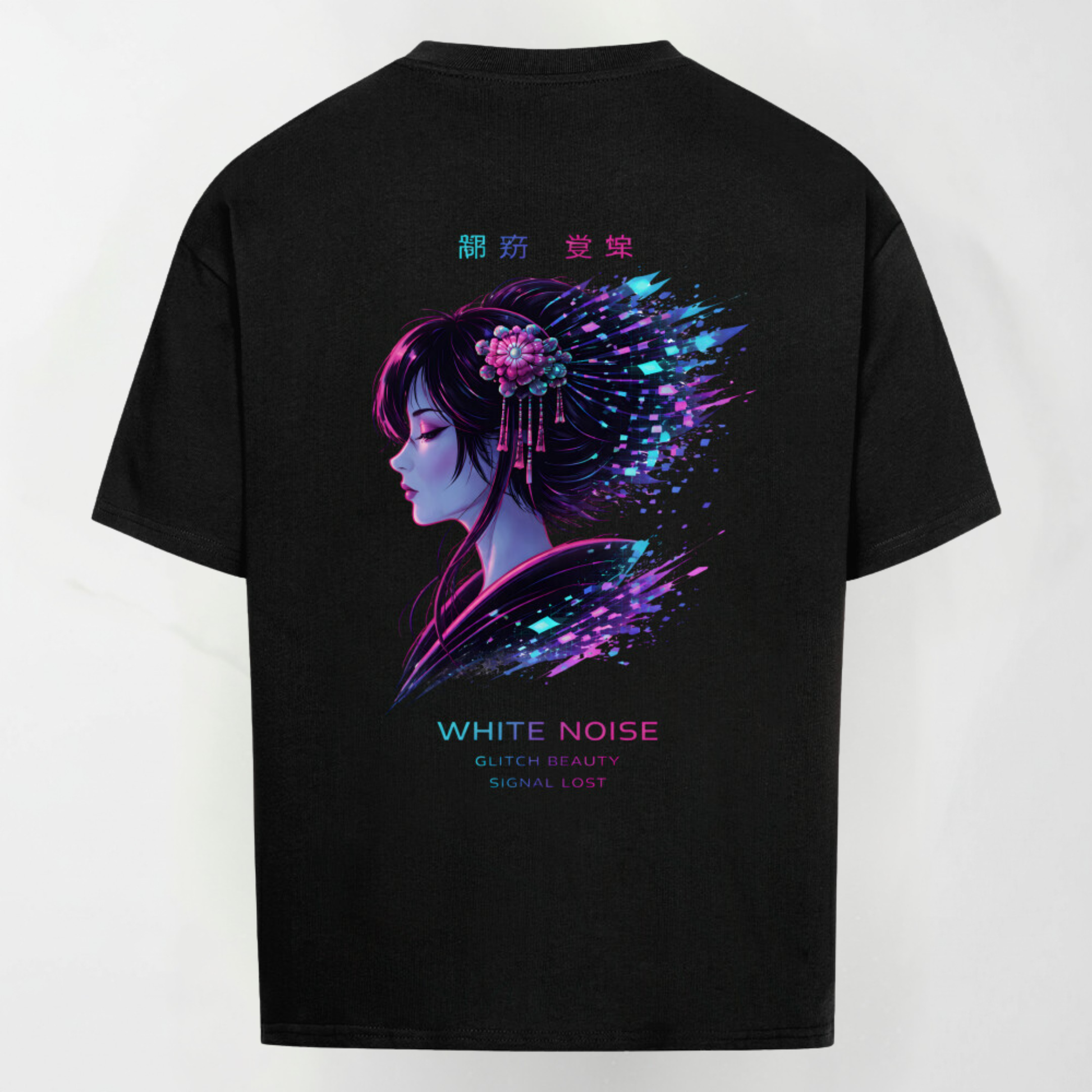 The White Noise T-shirt combines minimalist comfort with a futuristic streetwear style. The high-quality print ensures that the intense colors and glitch-like effects of the design last a long time.