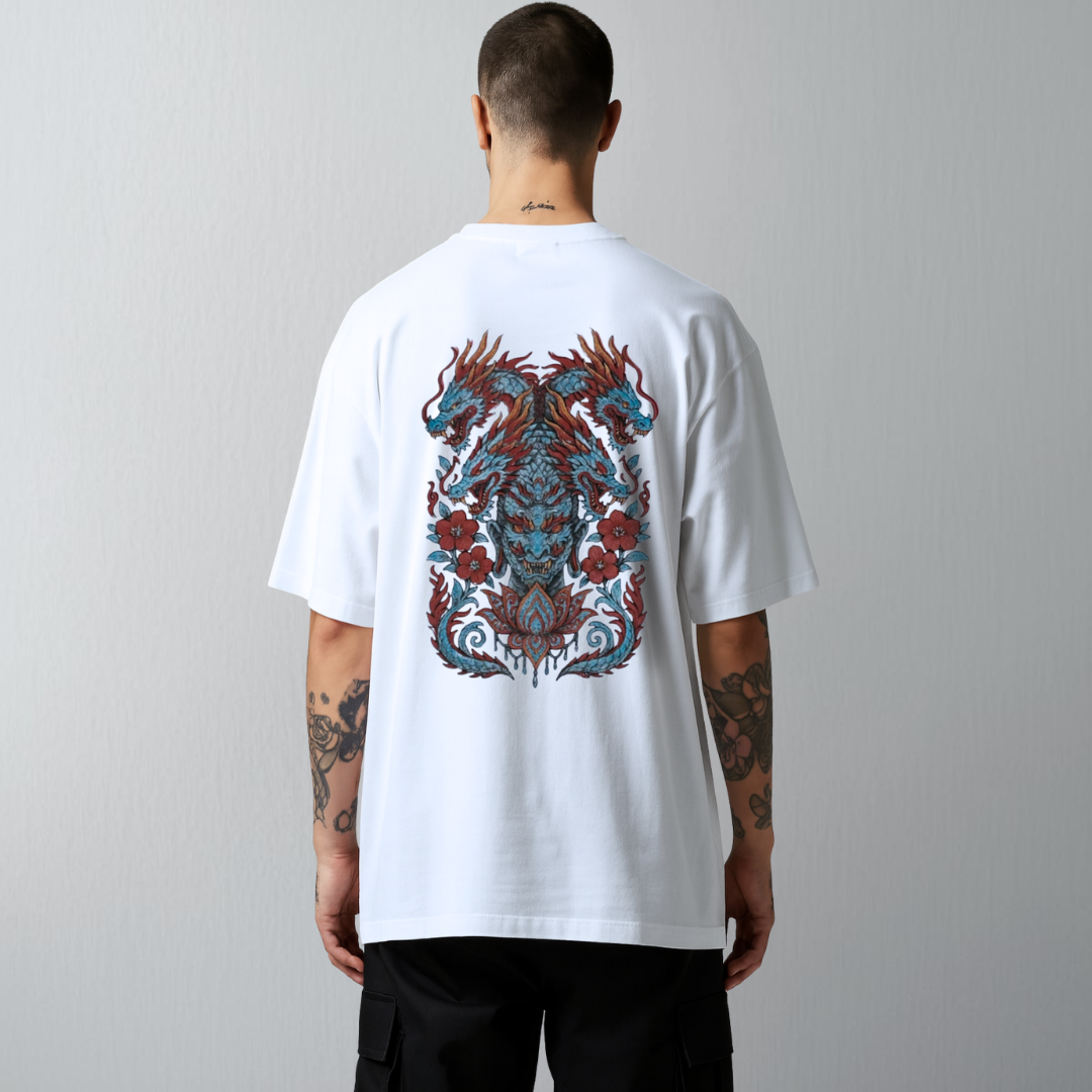 Dieses Oversize T-Shirt vereint minimalistisches Design mit kunstvoller Symbolik. Das exklusive Rückenmotive trägt den Namen „Drachenblüte“ und wurde in höchster Qualität aufgeklebt, wodurch die Farben außergewöhnlich intensiv und die Konturen präzise bleiben.
