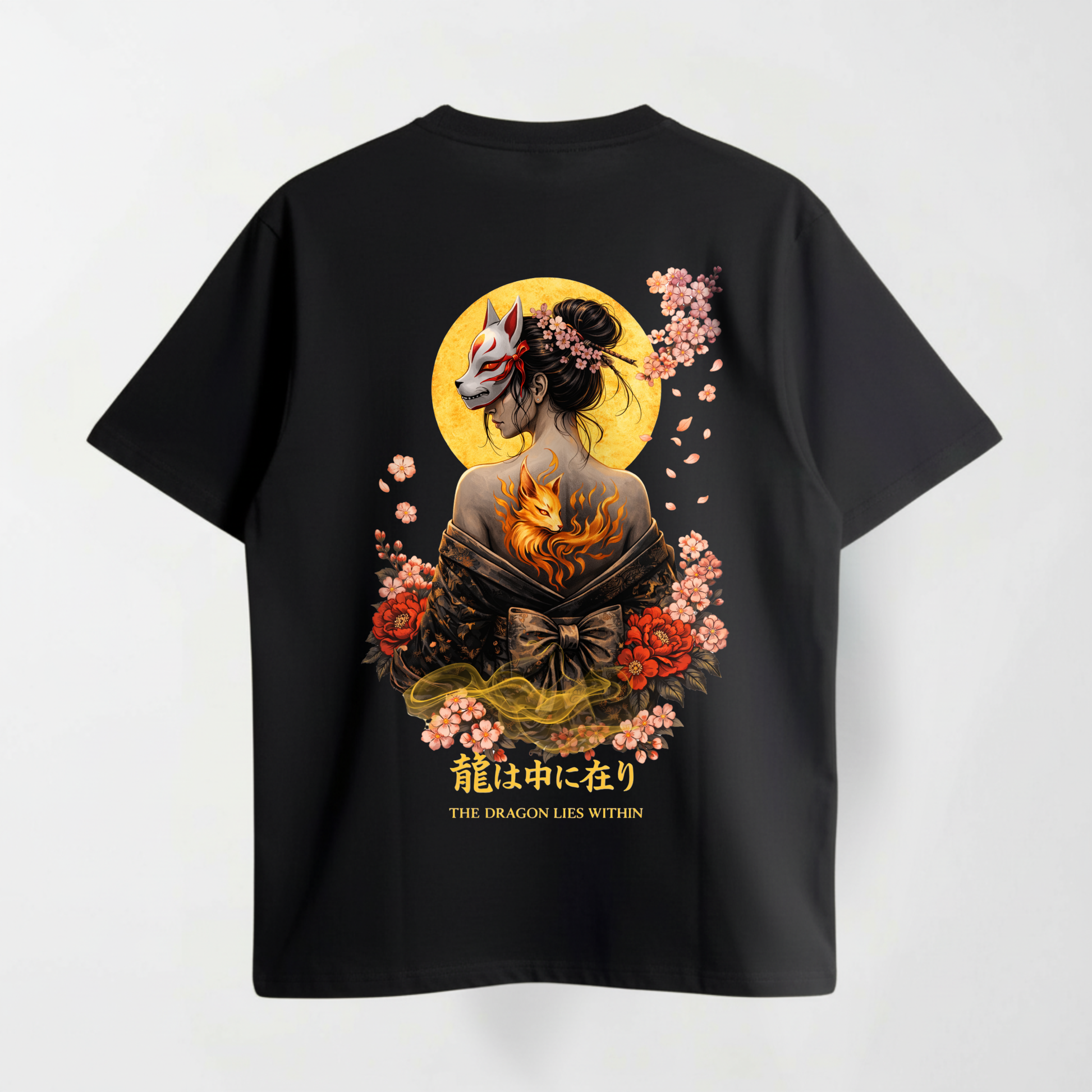 Das detailreiche Backprint-Design zeigt eine Frau mit Kitsune-Maske vor einem goldenen Mond. Auf ihrem Rücken erwacht ein flammender Drache – nicht als Zeichen von Zerstörung, sondern als Symbol innerer Macht, die lange geschlafen hat. Florale Elemente und warme Gold- und Rottöne verleihen dem Motiv eine mystische, fast heilige Ausstrahlung.