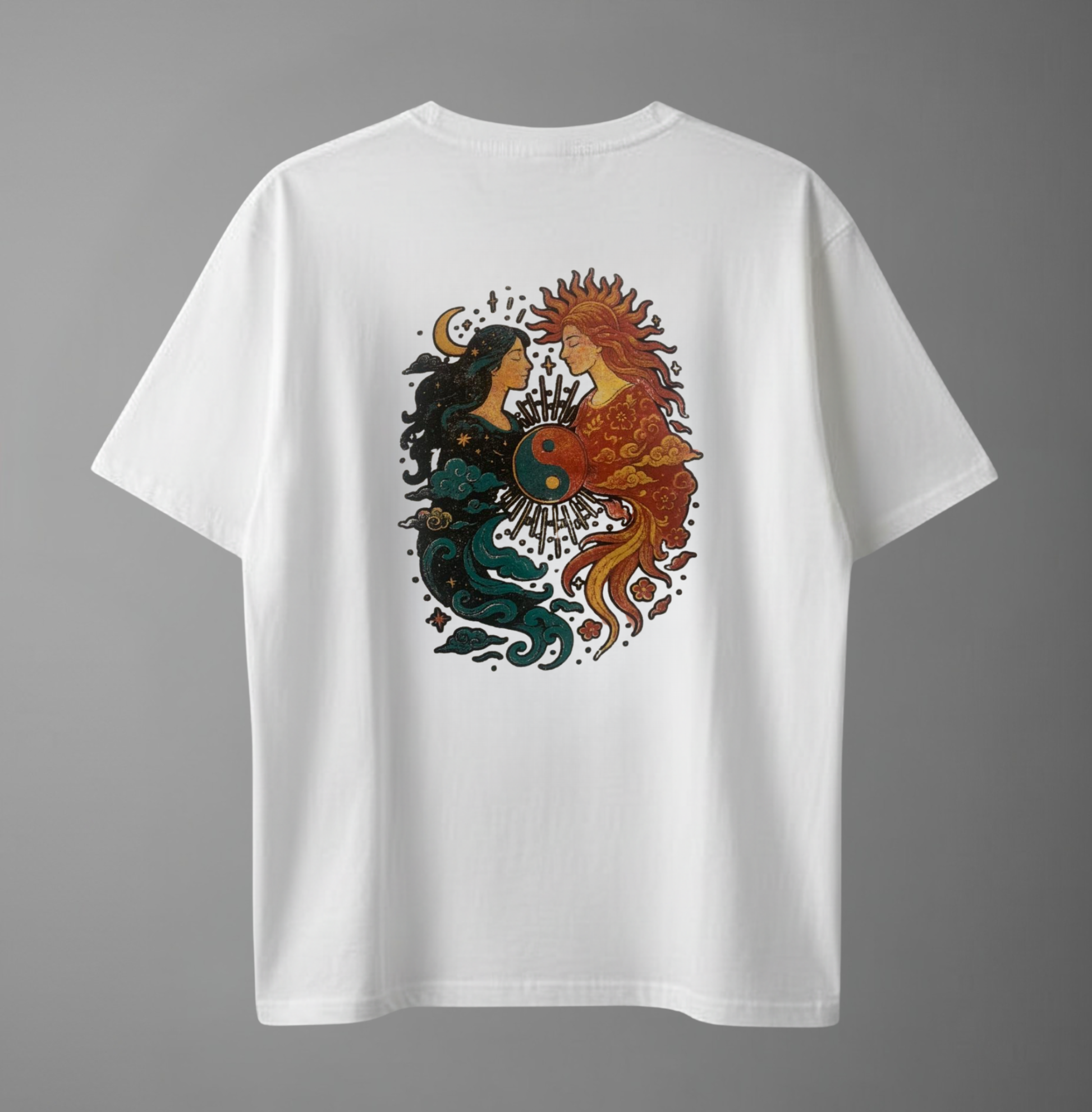 Dieses Oversize T-Shirt verbindet feine Kunst mit tiefer Symbolik. Das exklusive Rückenmotive „Ewiger Einklang – Wenn Sonne den Mond berührt“ wurde in höchster Qualität aufgeklebt, wodurch die warmen Rot- und Blautöne leuchten und selbst feinste Details gestochen scharf bleiben.