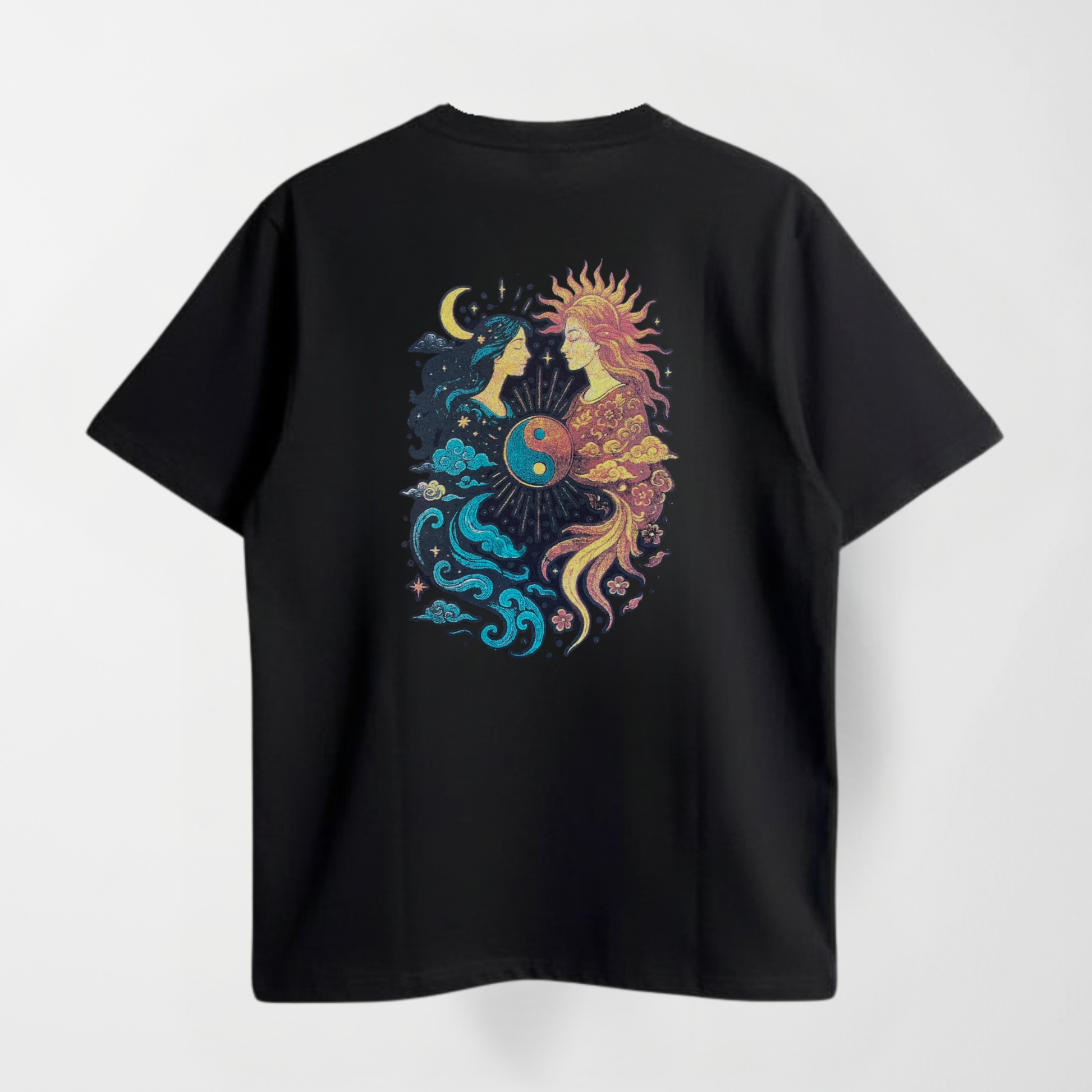 Dieses Oversize T-Shirt verbindet feine Kunst mit tiefer Symbolik. Das exklusive Rückenmotive „Ewiger Einklang – Wenn Sonne den Mond berührt“ wurde in höchster Qualität aufgeklebt, wodurch die warmen Rot- und Blautöne leuchten und selbst feinste Details gestochen scharf bleiben.